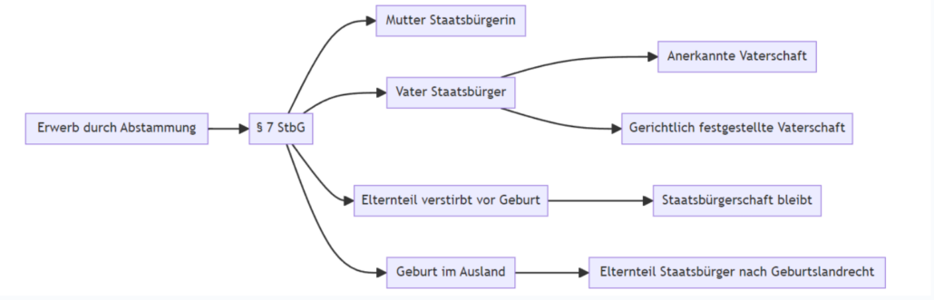 Ein Kind erhält die Staatsbürgerschaft bei Geburt, wenn mindestens ein Elternteil österreichischer Staatsbürger ist. Dies gilt auch, wenn die Vaterschaft innerhalb von acht Wochen nach der Geburt anerkannt oder gerichtlich festgestellt wird. Selbst wenn ein Elternteil vor der Geburt des Kindes verstirbt, wird das Kind Staatsbürger, solange der verstorbene Elternteil zum Zeitpunkt des Todes Staatsbürger war.